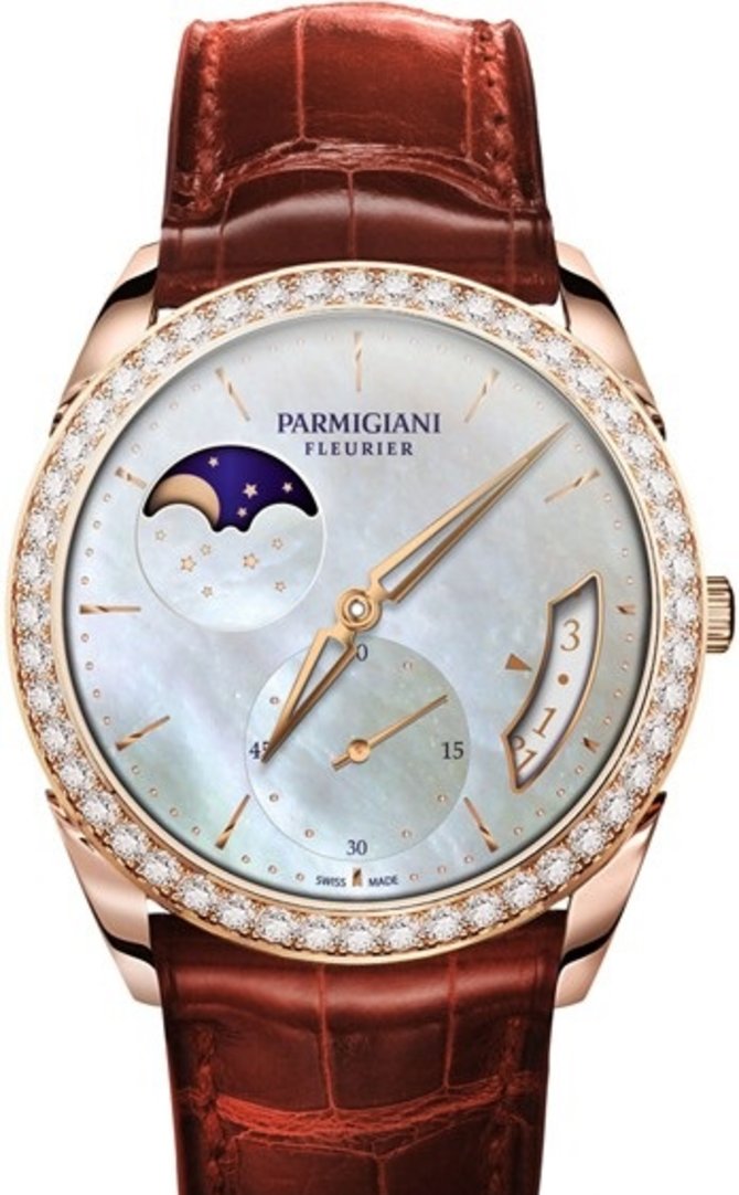 На перламутровом циферблате со скелетонированными стрелками указываются данные часов, минут, секунд, даты и фаз Луны. Индикацию перечисленных функций швейцарским часам Parmigiani Fleurier Tonda Tonda 1950 Lune PFC284-1063300-HA4021 обеспечивает мануфактурный швейцарский калибр PF708 с запасом хода на 48 часов. Корпус, выполненный из розового золота с инкрустацией бриллиантами, имеет 30-метровую водонепроницаемость. Также в комплекте идет ремень из кожи крокодила красного цвета и классическая пряжка из золота.
