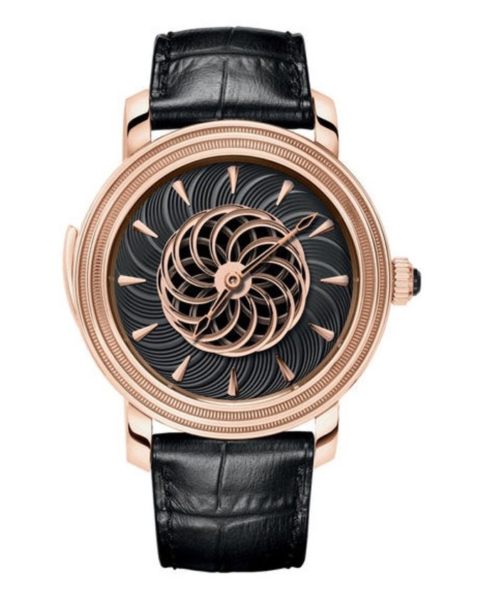Молодая швейцарская часовая мануфактура Parmigiani Fleurier представляет свою новую модель наручных часов в корпусе из розового 18-каратного золота, в котором находится надежный швейцарский мануфактурный механизм, калибр PF358, с ручным подзаводом, репетиром и 40-часовым запасом хода. Диаметр корпуса - 45 миллиметров; толщина корпуса - 14.1 миллиметра. На циферблате с художественным оформлением в стиле "оптический эффект" указываются данные часов и минут. Циферблат с ручной гравировкой мастера. Задняя крышка из сапфирового стекла, через которое видно механизм модели. На заводной головке рубиновый кабошон. Ремешок из кожи аллигатора поможет зафиксировать часы на руке.