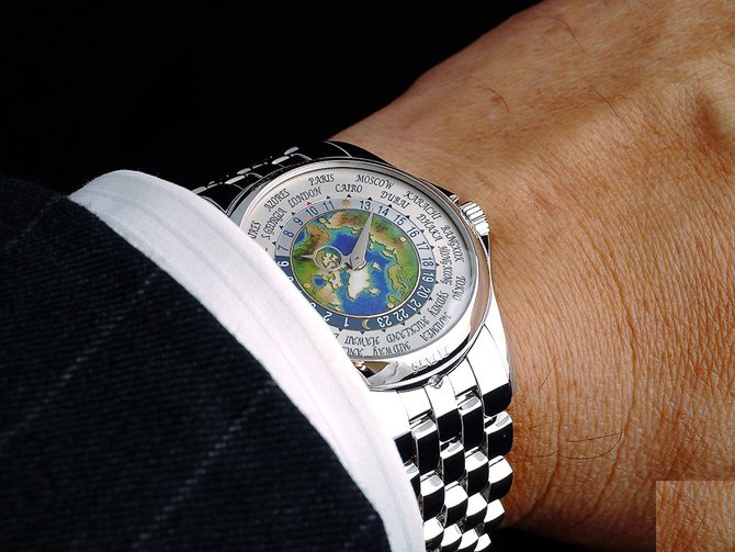 Модель для людей, любящих путешествовать - Patek Philippe Complications 5131 5131/1P-001 с функцией World Time - индикации времени 24-х городов мира. Корпус круглой формы, браслет и раскладная застежка выполнены из платины 950. Яркий циферблат с изображением карты мира накрыт сапфировым стеклом. Внутри часов стоит мануфактурный автоматический швейцарский механизм, калибр 240 HU от Patek Philippe, с двухсуточным уровнем запаса хода. Корпус имеет стандартную водонепроницаемость - 30 метров. Диаметр корпуса - 39.5 мм. На безеле корпуса расположена гравировка с содержанием "Patek Philippe" и "Geneve".