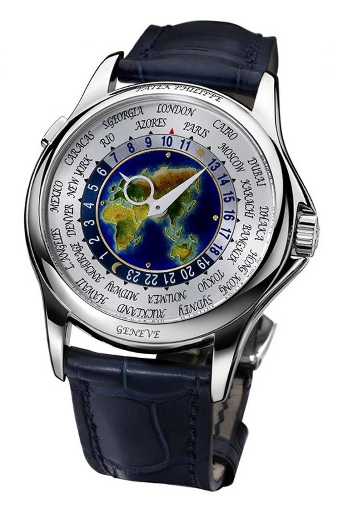 Люди говорят, что покупка часов Patek Philippe – ценное вложение, за которое Вас не раз благословят не только дети, но и внуки. Так что ценность Patek Philippe, растущая с годами, — еще один весомый вклад в копилку достижений компании. Корпус выполнен из 18К белого золота, диаметром 39,5мм. На бежевом циферблате часов изображена карта мира. В часах установлен мануфактурный автоматический механизм, , калибр 240 HU с запасом хода 48 часов. Ремешок из кожи аллигатора, темно синего цвета с золотой раскладной застежкой. Водонепроницаемость 30 м.