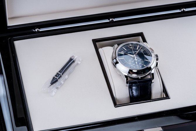 Швейцарский независимый бренд Patek Philippe в 2015 году выпустил великолепные "сложные" часы, которые по праву считаются одними из самых красивых и узнаваемых моделей коллекции и которые с гордостью могут передаваться от поколения к поколению. Это часы с технологиями будущего и традициями прошлого. Выпущены в корпусе из платины, размером 42 мм. В верхней части циферблата, который выполнен в технике "солнечные лучи", переливается от голубого до темно-синего цвета, расположились индикаторы даты, дня недели и месяца, по центру индикация часов, минут и большая секундная стрелка, у отметки 6 часов расположен 60-минутный накопитель хронографа. Так же на циферблате расположены накладные часовые метками, багетной формы, которые изготовлены из цельного белого золота. Задняя кришка часов специально выполнена из сапфирового стекла, для того, чтоб владелец мог видеть всю гениальность мануфактурного часового механизма с автоподзаводом, калибра CH 28-520 QA 24H, диаметром - 33,00 мм и высотой - 7,68 мм, собран из 402 деталей, на 37 драгоценных камнях. Балансовая частота - 28 800 полуколебаний/час (4 Гц). Запас хода составляет около 55 часов. Водонепроницаемость 30 метров. Ремешок из кожи крокодила, прошит вручную, синего цвета с классической застежкой из платины. По желанию клиента, возможно так же заказать дополнительно раскладную застежку из платины.