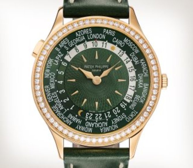 В 2011 году модель Self Winding 7130R-014 завершила многолетнюю традицию часов Patek Philippe World Time, представив женскую модель. В 2022 году мануфактура переосмысливает эту классику, украшая ее оригинальным, современным и элегантным оливково-зеленым цветом. Центр циферблата отдает дань уважения редкому мастерству с искусно выполненным вручную мотивом плетения корзин. Механический механизм с автоподзаводом, калибр 240 HU, с функцией мирового времени, индикацией дня/ночи и времени 24-х городов мира. Корпус из розового золота. Задняя крышка из сапфирового стекла. Водонепроницаемость корпуса - до 30 метров. Диаметр корпуса: 36 мм. Толщина: 8.83 мм. Ремень: кожа теленка, прошитая вручную. Застежка из розового золота - в комплекте. Безель инкрустирован бриллиантами.