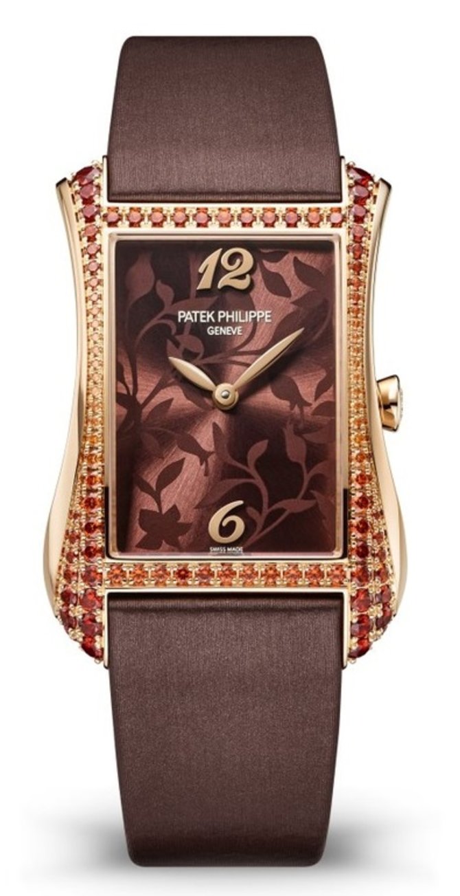 Швейцарские ювелирные часы Patek Philippe Gondolo Serata в корпусе из розового золота с инкрустацией 94 спессартинами бриллиантовой огранки (2,02 карата). Циферблат коричневого цвета украшен цветочным мотивом и защищен сапфировім стеклом. Ремешок из кожи теленка с золотой пряжкой. В часах установлен кварцевый механизм мануфактурной разработки - Калибр E 15. Водонепроницаемость до 30 метров.