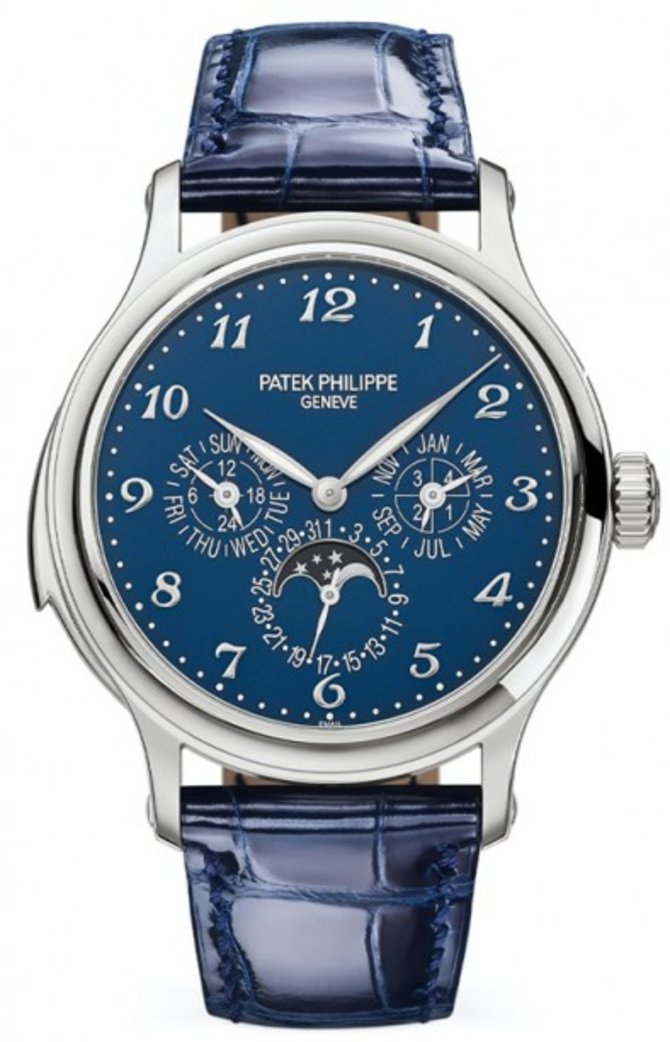 Швейцарская часовая мануфактура Patek Philippe представляет модель наручных часов с функциями вечного календаря и минутного репетира Grand Complications 5374 5374G-001. Установленный часовой механизм с автоподзаводом R 27 Q обеспечивает индикацию таких данных: часы, минуты, секунды, дата, день недели, месяц, цикл високосного года, фаза луны, индикатор день/ночь, цикл високосного года. Запас хода установленного мануфактурного калибра составляет 48 часов. Циферблат синего цвета накрыт стеклом из сапфирового кристалла с антибликовым покрытием. 42-миллиметровый корпус выполнен из белого золота и укомплектован ремнем из кожи аллигатора, который фиксирует часы на запястье руки. Застежка классического образца произведена из белого 18-каратного золота. На стрелки, указывающие состояние текущего времени, нанесен люминесцентный состав, светящийся в темноте.
