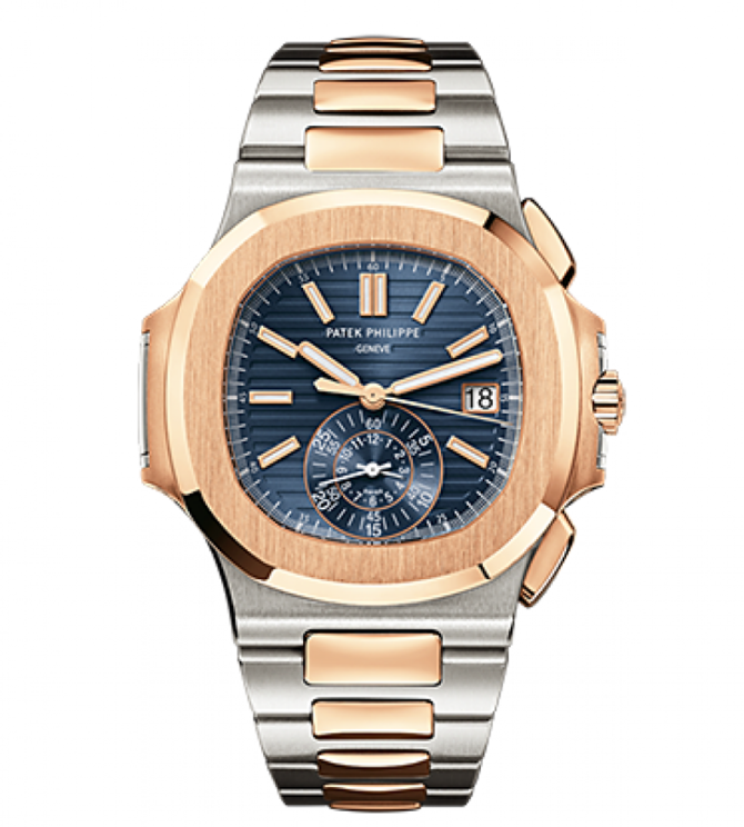 Patek Philippe Nautilus 5980/1AR-001 Механизм автоматический, Калибр CH 28-520 C. Размеры корпуса 40.5 мм. Корпус нержавеющая сталь и розовое золото 18к. Особенности Водостойкие, Хронограф. Функции часы, минуты, секунды, дата. Циферблат синий гильошированный. Запас хода 55 часов. Ремешок браслет из нержавеющей стали и розового золота 18к, откидная застежка. Дополнительная информация водонепроницаемость 120 м. Nautilus — это часы на все случаи жизни. С ними одинаково удобно идти на торжественный прием и купаться в бассейне. Они сочетаются с деловым костюмом точно так же, как с джинсами или плавками. Во-вторых, чтобы ни у кого не оставалось сомнений, что это настоящий Patek Philippe, реклама подчеркивала, что «одни из самых дорогих в мире часов сделаны из стали». Это был трюк, поскольку при цене в 4 000 франков они никак не могли считаться «одними из самых дорогих», но и дешевыми эти часы никогда не были, а среди стальных часов без усложнений, наверное, действительно были самыми дорогими и продолжают ими оставаться по сей день. Такой рекламный слоган помогал почитателям марки и будущим владельцам Nautilus не чувствовать себя «ущербными». Наконец, в-третьих, реклама подчеркивала, что с новыми часами можно погружаться на глубину до 120 метров, что было лучшим показателем для серийных часов того времени. В качестве дополнительного бонуса для «Наутилусов» была специально разработана легкая пробковая коробочка, в которой они продавались до 1990-х годов.