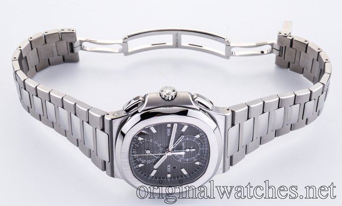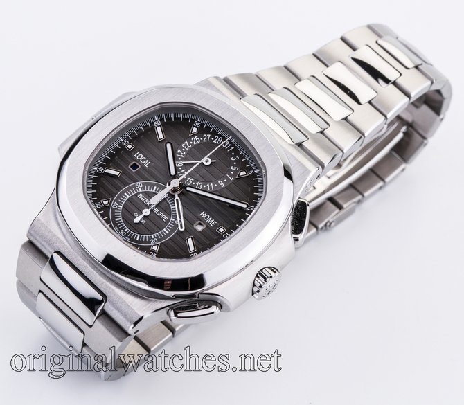 Новинка 2014г. Представлены на выставке BaselWorld 2014. Компания Patek Philippe представляет следующее поколение хронографов Nautilus, первый из которых был представлен в 2006 году по случаю 30-летия коллекции Nautilus. Новые Patek Philippe Travel Time Chronograph Ref. 5990/1A заменит модель Nautilus Chronograph Ref. 5980/1A. Впервые, в часах линейки Nautilus представлена комбинация функции второго часового пояса и хронографа (и день и ночь показателей). Внешний вид новинки остался практически без изменений, изменения коснулись функциональных возможностей и других тонких изменений дизайна. Энтузиасты Patek Philippe хорошо знают, что все усложнения, упомянутые выше, уже можно найти в других коллекциях Patek Philippe - но то, как они сочетаются в новом Nautilus Travel Time Chronograph является премьерой что, естественно, потребовало нового калибра. В новинке установлен автоматический механизм, калибр CH 28 - 520 C FUS работающий на частоте 4 Гц, с запасом хода приблизительно 45 - 55 часов.