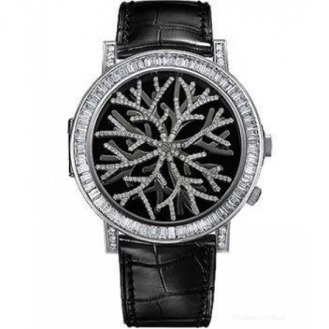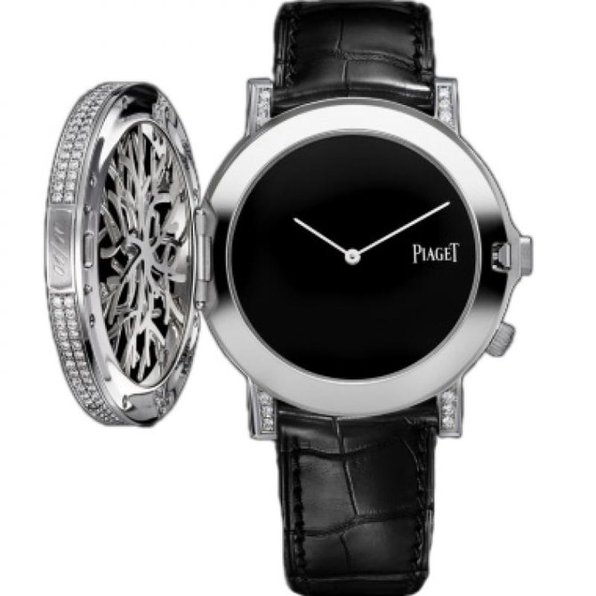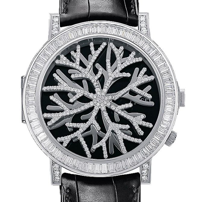Погружение в волшебный мир подводного царства. Благодаря уникальной конструкции расположенных один на другом корпусов, часовая стрелка ведет отсчет времени, игриво спрятавшись за коралловым рифом. Под драгоценной крышкой с бриллиантовыми волнами скрываются ультратонкие механические часы. В корпусе с ободком, украшенным бриллиантами багетной огранки, коралл из белого золота, выполненный методом декалькомании, таинственно появляется и исчезает под украшенными бриллиантами подвижными ответвлениями коралла, оживающими при каждом движении запястья. Верхний корпус из белого золота с 60 бриллиантами багетной огранки (около 4.6 карата) и 616 бриллиантами круглой огранки (около 3.7 карата). Нижний корпус из белого золота 18 карат. Верхний циферблат с двойным мотивом «коралл». Заводная головка с бриллиантом круглой огранки (около 0.1 карата). Застежка с 26 бриллиантами круглой огранки (около 0.4 карата). Ультратонкий мануфактурный механизм Piaget 830P с ручным заводом. Ограниченная пронумерованная серия из 10 экземпляров. Водонепроницаемость данной модели до 3 бар(30 метров). Имеют сапфировое стекло. Браслет выполнен из кожи аллигатора. Имеется задняя крышка из сапфирового стекла. Застежка раскладывающаяся.