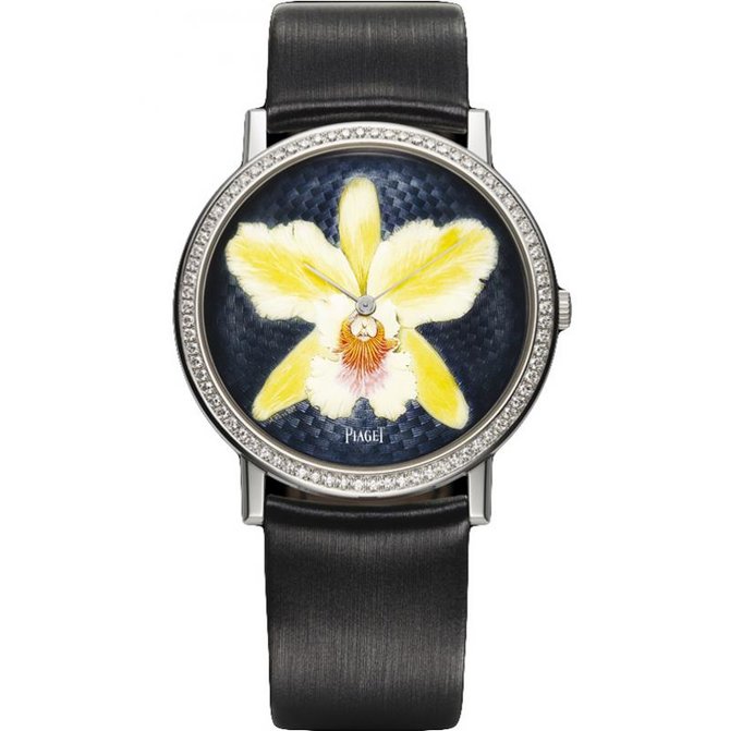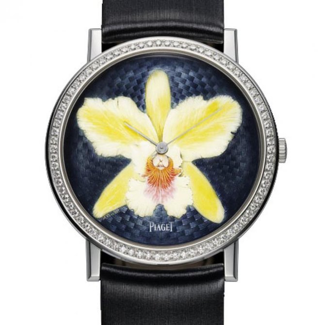 Piaget вновь обращается к миру орхидей, создавая 4 уникальных, завораживающих произведения часового и ювелирного искусства. Художница-эмальер украсила циферблат этих часов миниатюрой, изображающей орхидею Laeliocattleya «Irene yellow». Цветок, выполненный в технике эмали «grand feu», изображен на фоне, который был вручную украшен тонким гильошированным узором, а затем покрыт слоем прозрачной эмали «flinqué». Мастерство эмальера и гравера находит продолжение в работе часовщиков Piaget, владеющих всеми секретами создания ультратонких механизмов, декорированных в соответствии с принципами Высокого часового искусства. Водонепроницаемость данной модели до 3 бар(30 метров). Имеют сапфировое стекло. Браслет выполнен из кожи аллигатора. Корпус из белого золота 18 карат с 78 бриллиантами круглой огранки (около 0.7 карата). Циферблат с эмалью с мотивом орхидеи. Ультратонкий мануфактурный механизм с ручным заводом Piaget 430P. Единственный экземпляр. Имеется задняя крышка из сапфирового стекла.