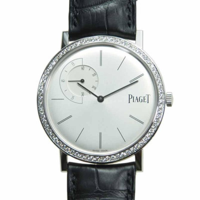 Подлинный гимн чистоте и строгости классического дизайна – ультратонкие часы, верные традиционным эстетическим кодам Piaget. Строгий циферблат и удивительно тонкие продолговатые стрелки подчеркивают минималистский стиль этой модели Altiplano, оснащенной смещенной от центра малой секундной стрелкой. Механизм часов можно увидеть через заднюю крышку из сапфирового стекла. Водонепроницаемость данной модели до 3 бар(30 метров). Имеют сапфировое стекло. Браслет выполнен из кожи аллигатора. Корпус из белого золота 18 карат с 72 бриллиантами круглой огранки (около 1 карата). Задняя крышка из сапфирового стекла. Ультратонкий мануфактурный механизм с ручным заводом Piaget 838P. Малая секундная стрелка. Застежка классическая.
