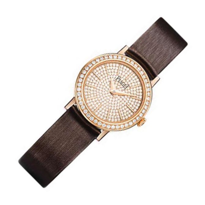 Необычайно женственная коллекция Altiplano — эталон элегантности среди ультратонких часов — выходит в новом формате. Миниатюрная модель диаметром 24 мм выполнена в сдержанном стиле без излишних деталей. На циферблате с бриллиантовой отделкой и легким радужным отливом часовые индексы приобретают невероятно нежный оттенок, а золотой корпус, украшенный кольцом из 48 бриллиантов, придает часам ноту изысканности. Корпус из розового золота 18 карат с 48 бриллиантами круглой огранки (около 0,4 карата). Циферблат со 180 бриллиантами круглой огранки (0.6 карата) и с часовыми индексами из розового золота 18 карат. Застежка с 13 бриллиантами круглой огранки (около 0.04 карата). Кварцевый механизм Piaget 690P. Уникальное, наполненное свежестью творение предлагается в версии из розового золота на коричневом атласном ремешке. Водонепроницаемость данной модели до 3 бар(30 метров). Имеют сапфировое стекло. Браслет выполнен из атласа. Застежка классическая.