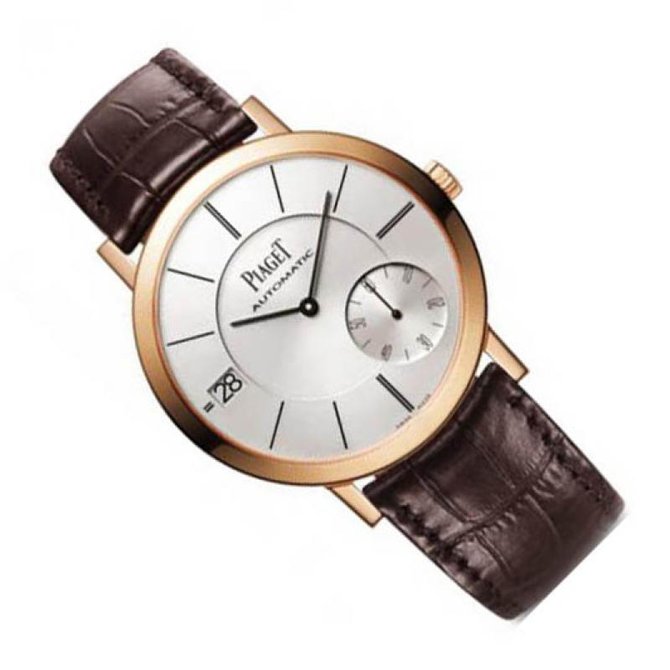 Новая сложная функция, новый двойной рекорд тонкости. Часы Altiplano впервые оснащаются функцией календаря, одновременно устанавливая новый мировой рекорд тонкости в своей категории, как на уровне механизма, так и на уровне корпуса. Самый тонкий в мире механизм толщиной 3 мм и корпус толщиной 6.36 мм, ставшие наглядным воплощением сути часового искусства, свидетельствуют о том, что даже технические решения высшей степени сложности могут быть реализованы в миниатюре. Изготовленный из розового золота корпус диаметром 40 мм был специально разработан для механизма 1205P с указателем даты и малой секундной стрелкой. Трехуровневый циферблат и изящный эффект чередования простых и двойных часовых индексов напоминают об эстетике, характерной для ультратонких автоматических часов Piaget. Ротор из розового золота 22 карата. Эти роскошные часы, отличающиеся не подверженной моде строгостью и чистотой стиля, буквально обречены на статус классической модели, которая переживет свое время. Калибр 1205P с автоподзаводом, малой секундной стрелкой и указателем даты, самый тонкий механизм в мире (толщина 3 мм) стал двенадцатым по счету механизмом, специально созданным для коллекции Piaget Altiplano, и достойным наследником калибра 1208Р, представленного Piaget в 2010 году. Он вновь раздвинул горизонты совершенства, демонстрируя рекордную тонкость 3 мм. Сложнейший механизм состоит из 221 детали. Терпеливо изготовленные и собранные вручную, они соперничают друг с другом в миниатюрности. В соответствии с традицией асимметричного расположения указателей, окошко даты в положении «9 часов» перекликается с малой секундной стрелкой в положении «5 часов». Декор механизма 1205P отражает его неповторимый характер: на градуснике выгравирована буква «P» – фирменный инициал Piaget, имитирующий секретную подпись. Круговой узор Côtes de Genève, платина с жемчужным зернением, мосты со скошенными углами, колеса с узором в виде солнечных лучей и вороненые винты завершают облик этого исключительного механизма согласно эстетическим канонам швейцарской ма