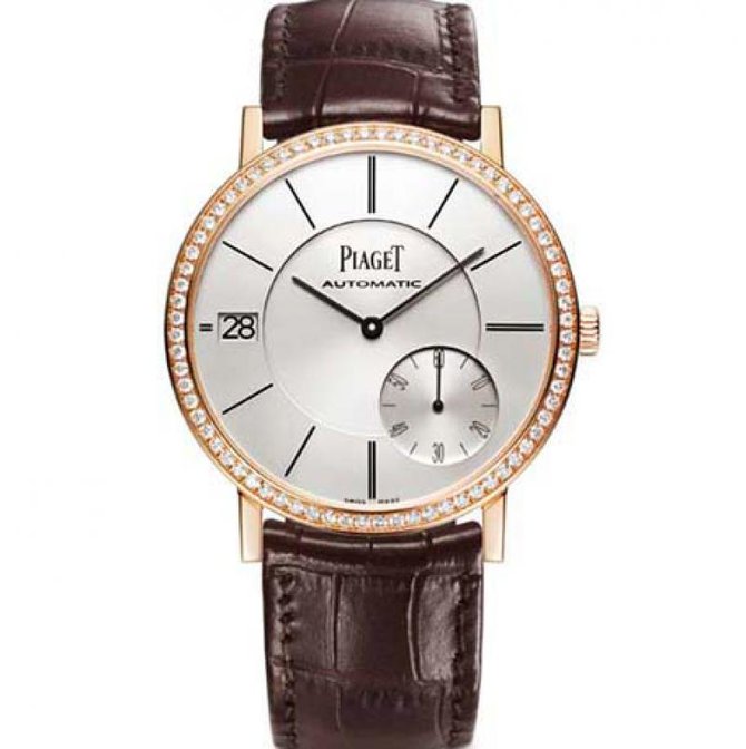 Новая сложная функция, новый двойной рекорд тонкости. Часы Altiplano впервые оснащаются функцией календаря, одновременно устанавливая новый мировой рекорд тонкости в своей категории, как на уровне механизма, так и на уровне корпуса. Механизм толщиной 3 мм и корпус толщиной 6.36 мм, ставшие наглядным воплощением сути часового искусства, свидетельствуют о том, что даже технические решения высшей степени сложности могут быть реализованы в миниатюре. Изготовленный из розового золота и украшенный 72 бриллиантами корпус диаметром 40 мм был специально разработан для механизма 1205P с указателем даты и малой секундной стрелкой. Трехуровневый циферблат и изящный эффект чередования простых и двойных часовых индексов напоминают об эстетике, характерной для ультратонких автоматических часов Piaget. Эти роскошные часы, отличающиеся не подверженной моде строгостью и чистотой стиля, буквально обречены на статус классической модели, которая переживет свое время. Корпус из розового золота 18 карат с бриллиантами круглой огранки (около 1 карата). Задняя крышка из сапфирового стекла. Калибр 1205Р с автоподзаводом, малой секундной стрелкой и указателем даты, самый тонкий механизм в мире (толщина 3 мм) стал двенадцатым по счету механизмом, специально созданным для коллекции Piaget Altiplano, и достойным наследником калибра 1208Р, представленного Piaget в 2010 году. Он вновь раздвинул горизонты совершенства, демонстрируя рекордную тонкость 3.00 мм. Сложнейший механизм состоит из 221 детали. Ротор из розового золота 22 карата. Терпеливо изготовленные и собранные вручную, они соперничают друг с другом в миниатюрности. В соответствии с традицией асимметричного расположения указателей, окошко даты в положении «9 часов» перекликается с малой секундной стрелкой в положении «5 часов». Декор механизма 1208Р отражает его неповторимый характер: на градуснике выгравирована буква «P» – фирменный инициал Piaget, имитирующий секретную подпись. Круговой узор Côtes de Genève, платина с жемчужным зернением, мосты со скошенными углами, колеса, украшенн