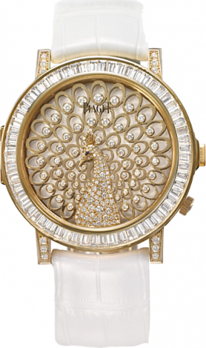 Модель оригинальных швейцарских наручных часов с откидной крышкой Piaget Altiplano 43 mm Double Peacock G0A38582 является новинкой компании-производителя. Часы представлены в корпусе из желтого золота, который инкрустирован белыми классическими и багетными бриллиантами. Художественный циферблат, также декорированный драгоценными камнями, показывает часы и минуты. Водонепроницаемость корпуса составляет 30 метров, диаметр - 43 мм. Дополнительная защита механизма с ручным заводом осуществляется с помощью лицевого сапфирового стекла. Механизм обладает 60-часовым запасом хода. Серия ограничена - всего 8 экземпляров. Год выпуска - 2014. Комплектуются наручные часы ремешком из кожи аллигатора с классической пряжкой из желтого золота. Огранка оказывает влияние на сверкание и искристость бриллианта. Когда огранка хорошая, свет отражается от одной грани к другой и затем рассеивается через верхнюю часть бриллианта. Если огранка слишком поверхностная или глубокая, свет уходит через нижнюю часть бриллианта или в противоположные стороны. Бриллианты компании-производителя гранятся в традиционном Бриллантовом стиле.