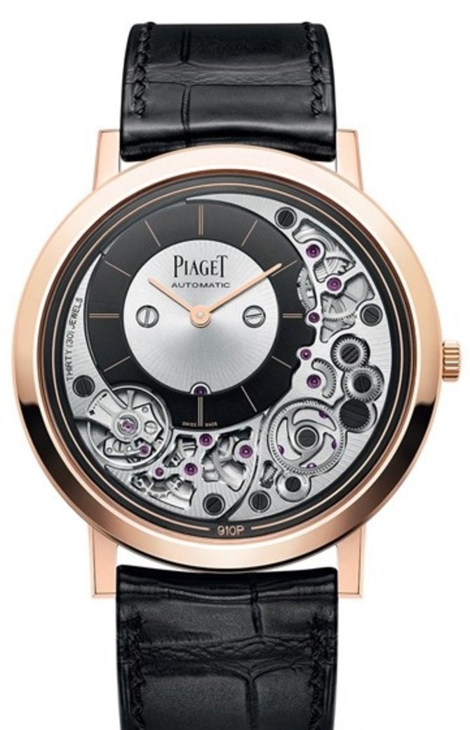 Швейцарский часовой бренд Piaget, основное производство которого - наручные часы класса люкс, представил модель наручных часов в круглом корпусе из розового золота Altiplano Ultimate 910P G0A43120 с возможностью индикации текущего времени. Модель выполняет свою основную функцию на базе автоматического мануфактурного калибра 910P, что был отмечен статусом хронометра. Запас хода механизма составляет 50 часов. Корпус из розового золота герметичен до 30 метров. Циферблат накрыт стеклом из сапфирового кристалла с противобликовыми свойствами.