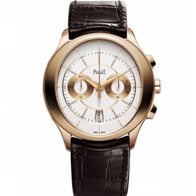 Новая линия Gouverneur, сочетающая техническое совершенство со смелым дизайном, воплощает в себе высочайшее мастерство и верность историческим ценностям Piaget. Линия является частью коллекции Black Tie и выполнена в лучших традициях марки: часы с тщательно продуманной круглой формой корпуса и характерным дизайном оснащены механическими калибрами и сложными функциями, полностью разработанными и собранными на Мануфактуре. Для модели Gouverneur часовщики Piaget разработали оригинальный корпус, в дизайне которого гармонично сочетаются окружность и овал. Субтильное чередование форм, образующих архитектуру циферблата, придает облику часов изысканность и соразмерность и создает атмосферу вечного обновления и совершенства. Хронограф Gouverneur с новым ультратонким автоматическим калибром 882P отличается расположением счетчиков, характерным для старинных хронографов. Он оснащен функцией flyback, а также часовой и минутной стрелками, указателем времени второго часового пояса и указателем даты. Ротор из розового золота с гербом Piaget сочетается по цвету с элегантным посеребренным циферблатом, добавляя изысканный штрих в оформление часов. Водонепроницаемость данной модели до 3 бар(30 метров). Имеют сапфировое стекло. Браслет выполнен из кожи аллигатора. Имеется задняя крышка из сапфирового стекла. Застежка раскладная.