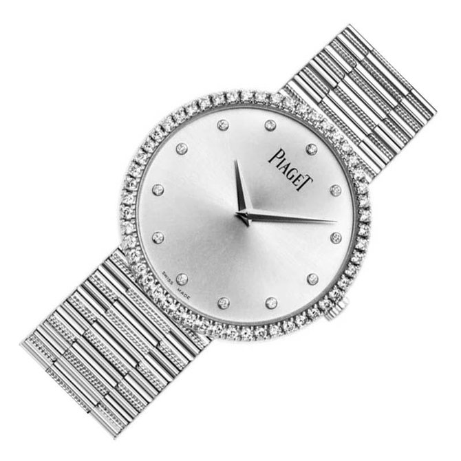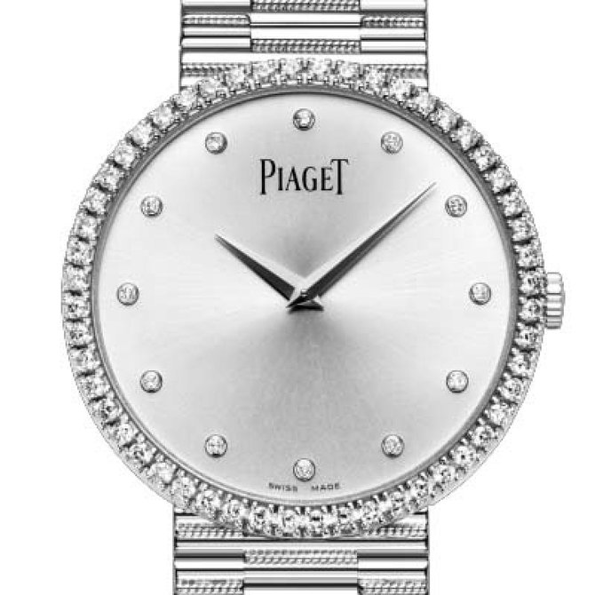 Эти ультратонкие классические часы выделяются не только своими чистыми линиями и элегантностью в стиле ретро, но и великолепным пластичным браслетом с уникальным плетением. При создании этой модели, легко узнаваемой благодаря отделке браслета в виде припаянных к звеньям скрученных нитей, Piaget обращается к своему богатому историческому опыту. Эти классические часы из белого золота, сияющие блеском бриллиантов, оснащены самым тонким механическим калибром Мануфактуры Piaget. Водонепроницаемость данной модели до 3 бар(30 метров). Имеют сапфировое стекло. Браслет выполнен из золота. Застежка интегрированная. Корпус из белого золота 18 карат с 52 бриллиантами круглой огранки (около 0.8 карата). Циферблат с часовыми индексами из 12 бриллиантов круглой огранки (около 0.1 карата). Браслет из белого золота 18 карат. Ультратонкий мануфактурный механизм Piaget 430P с ручным заводом.