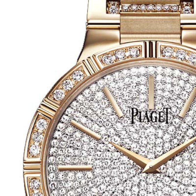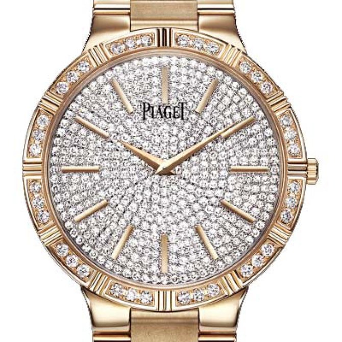 Часы Dancer впервые полностью облачаются в бриллианты: ими усыпаны даже характерные промежуточные звенья браслета. Особая техника закрепки драгоценных камней позволила сохранить характерную эстетику часов и создать контраст полированных и матовых поверхностей, не нанеся при этом ущерба стилю и пластичности всего творения. Водонепроницаемость данной модели до 3 бар(30 метров). Имеют сапфировое стекло. Браслет выполнен из отделки драгоценными камнями, золота. Застежка интегрированная. Корпус из розового золота 18 карат с 36 бриллиантами круглой огранки (около 0.7 карата). Циферблат с 438 бриллиантами круглой огранки (около 1.5 карата) и с часовыми индексами из розового золота 18 карат. Браслет с 220 бриллиантами круглой огранки (около 1.5 карата). Задняя крышка из сапфирового стекла. Ультратонкий мануфактурный механизм Piaget 430P с ручным заводом.