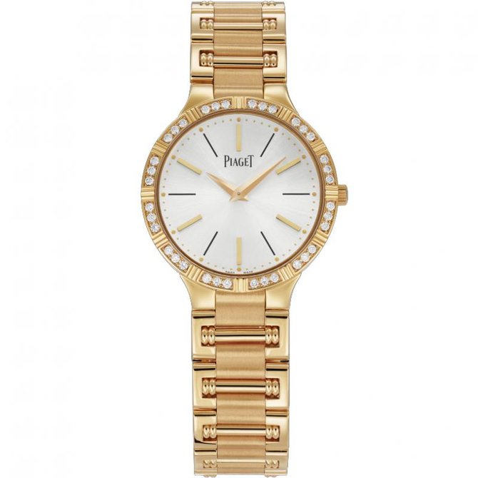 Невероятную женственность этих часов Dancer подчеркивает маленький корпус из розового золота диаметром 28 миллиметров. Сохраняя верность эстетическим канонам коллекции, эти вечерние часы с бриллиантами на ободке украшены знаменитыми двойными рельефными элементами. Корпус из розового золота 18 карат с 36 бриллиантами круглой огранки (около 0.3 карата). Циферблат с часовыми индексами из розового золота 18 карат. Браслет из розового золота 18 карат. Кварцевый механизм Piaget 857P. Водонепроницаемость данной модели до 3 бар(30 метров). Имеют сапфировое стекло. Браслет выполнен из отделки драгоценными камнями, золота. Застежка интегрированная.
