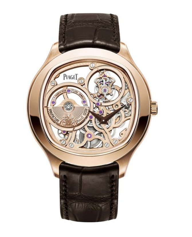 Невероятные скелетонизированные швейцарские наручные часы от часовой мануфактуры Piaget - новинка 2015 года. Часы выпущены в корпусе подушкообразной формы, диаметром 46.5 мм, изготовленном из розового 18-каратного золота. На циферблате-скелетоне указываются часы и минуты. Циферблат с двух сторон надежно защищается сапфировым стеклом. Калибр Piaget 1270S, установленный в этой модели, работает от автоматического подзавода и обладает функцией турбийона, которую отчетливо видно сквозь сапфировое стекло. Ремешок из кожи луизианского аллигатора дополняет наручные часы.