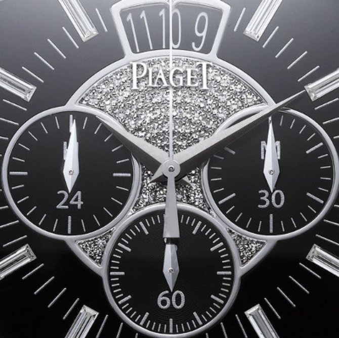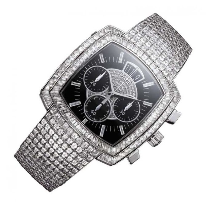 Мастера Piaget создают исключительные модели часов, воплощающие союз часового и ювелирного искусства. Механизм 880P с дополнительными функциями, отвечающими современным требованиям, размещается в характерном корпусе в форме «подушечка», щедро украшенном бриллиантами, в том числе по краям корпуса и вокруг задней крышки из сапфирового стекла. Водонепроницаемость данной модели до 3 бар(30 метров). Имеют сапфировое стекло. Корпус из белого золота 18 карат с 92 бриллиантами багетной огранки (около 7.1 карата) и 381 бриллиантом круглой огранки (около 1.4 карата). Циферблат со 118 бриллиантами круглой огранки (около 0,3 карата) и часовыми индексами с 9 бриллиантами багетной огранки (около 0.3 карата). Заводная головка с бриллиантом круглой огранки (около 0.2 карата) и 8 бриллиантами багетной огранки (около 0.3 карата). Браслет из белого золота 18 карат с 840 бриллиантами круглой огранки (около 39.2 карата). Ультратонкий мануфактурный механизм с автоматическим подзаводом Piaget 880P. Хронограф, малая секундная стрелка, указатели даты и второго часового пояса. Браслет выполнен из отделки драгоценными камнями, золота. Застежка интегрированная.