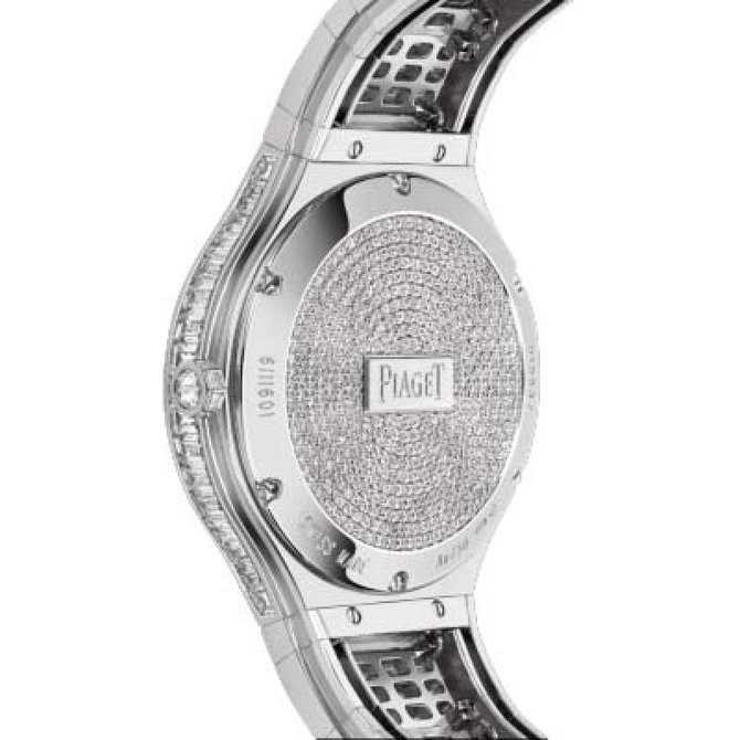 Россыпь бриллиантов багетной огранки служит роскошным одеянием для этой драгоценной модели Piaget Polo, выдержанной в стиле Высокого ювелирного искусства. Уникальные формы и изысканный геометрически сложный декор сохраняют всю силу оригинального дизайна, характерного для коллекции Piaget Polo. В корпусе из белого золота установлен мануфактурный механизм Piaget с автоматическим заводом. Водонепроницаемость данной модели до 3 бар(30 метров). Имеют сапфировое стекло. Браслет выполнен из отделки драгоценными камнями, золота. Застежка интегрированная. Корпус из белого золота 18 карат с 429 бриллиантами круглой огранки (около 1.9 карата), 64 бриллиантами багетной огранки (около 7.1 карата) и 16 бриллиантами изумрудной огранки (около 3.2 карата). Циферблат с 72 бриллиантами круглой огранки (около 6.7 карата). Заводная головка украшена одним бриллиантом круглой огранки (около 0.1 карата) и 8 бриллиантами багетной огранки (около 0.1 карата). Браслет из белого золота 18 карат с 342 бриллиантами багетной огранки (около 29.4 карата). Мануфактурный механизм Piaget 530P с автоматическим заводом.