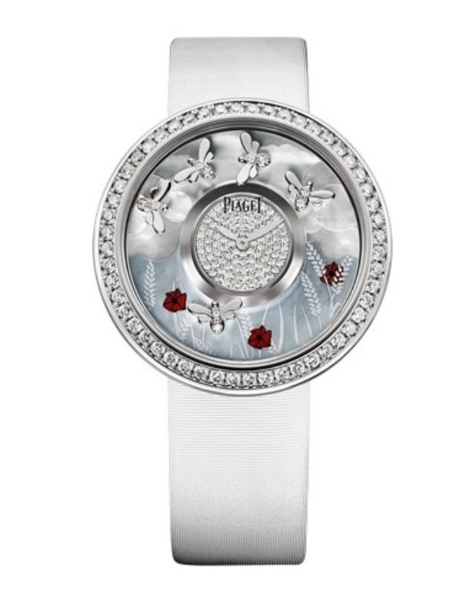 Роскошная ювелирная модель женских швейцарских часов, созданная компанией Piaget, выпущена в круглом корпусе из белого 18 каратного золота, безель которого декорирован с помощью белых бриллиантов классической огранки. Художественные элементы на циферблате выполнены из белого золота и покрыты белыми бриллиантами. Стрелки, служащие индикаторами часов и минут, выполнены из белого золота. Малый циферблат полностью покрыт драгоценными камнями. Защитное лицевое стекло циферблата - сапфировое. Модель укомплектована белым сатиновым ремешком с застежкой из белого золота. В действие часы приводит кварцевый мануфактурный швейцарский механизм от Piaget.