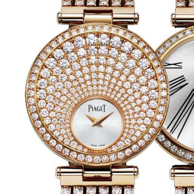 Подлинный переворот! Эта модель Limelight Twice самым оригинальным образом переворачивается, указывая время в двух различных часовых поясах. Двуликое изделие с одним видимым и одним скрытым от глаз циферблатом отличается женственной смелостью стиля. Чистоту линий не нарушает даже заводная головка: ее заменяют потайные кнопки, скрытые в креплении корпуса. В версии, созданной по канонам высокого ювелирного искусства, часы дополняет великолепный браслет из розового золота, одна сторона которого состоит из круглых миниатюрных полированных пластинок, а другая украшена бриллиантами. Этот двусторонний браслет с интегрированной двусторонней застежкой отличается непревзойденной гибкостью. Водонепроницаемость данной модели до 3 бар(30 метров). Имеют сапфировое стекло. Браслет выполнен из отделки драгоценными камнями, золота. Корпус из розового золота 18 карат с 278 бриллиантами круглой огранки (около 5.8 карата). Двусторонний браслет из розового золота 18 карат с 300 бриллиантами круглой огранки (около 12.9 карата). Застежка со 102 бриллиантами круглой огранки (около 0.3 карата). Два кварцевых механизма Piaget 56P. Застежка интегрированная.