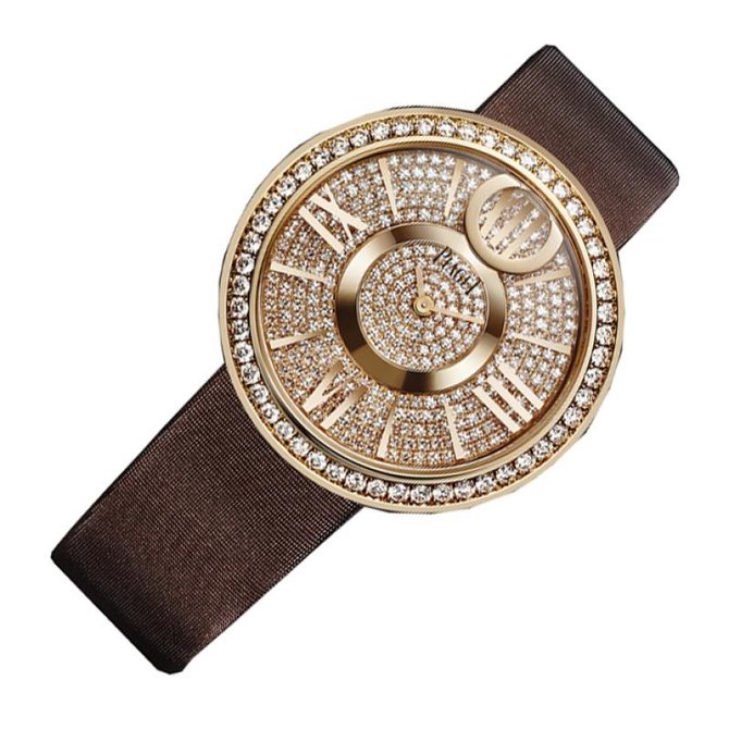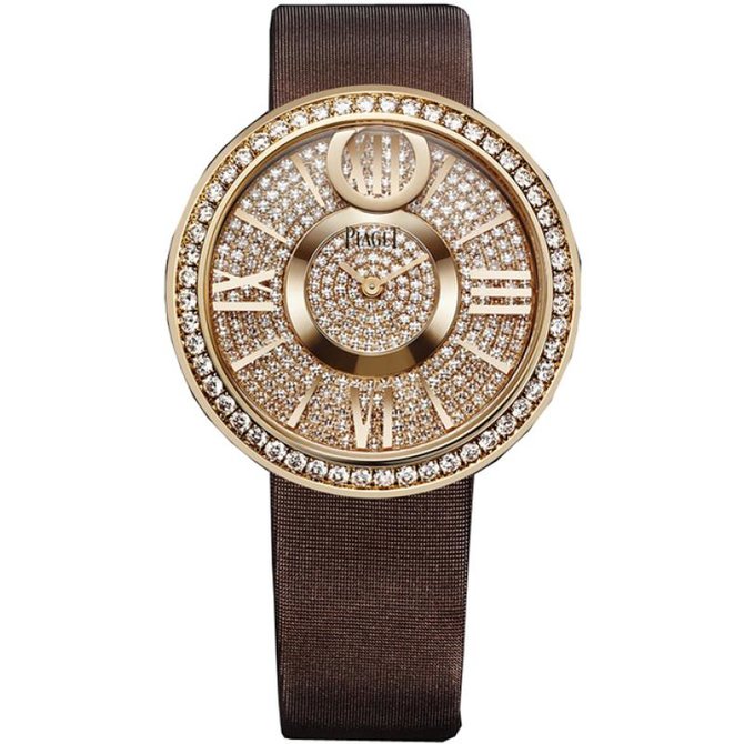 Придуманный и разработанный Мануфактурой Piaget концепт Limelight Dancing Light позволяет добиться уникального эффекта кружащегося над циферблатом подвижного декора. При малейшем движении кисти он с удивительной легкостью вращается то в одну, то в другую сторону. Piaget, как никто другой, владеет искусством демонстрировать чудеса, не раскрывая при этом секретов технологии. Оригинальный визуальный эффект модели Limelight Dancing Light достигается с помощью небольшого диска, двигающегося над кругом, образованным римскими цифрами и накладными часовыми индексами в форме палочек. Вращаясь вокруг центральной зоны указания часов, он образует восьмерку – символ вечности. Круглый корпус, лишенный заводной головки, отличается безупречной чистотой линий, которую подчеркивают бриллианты, украшающие ободок часов. Водонепроницаемость данной модели до 3 бар(30 метров). Имеют сапфировое стекло. Браслет выполнен из атласа.Корпус из розового золота 18 карат с 52 бриллиантами круглой огранки (около 1.6 карата). Циферблат с 335 бриллиантами круглой огранки (около 2.3 карата). Застежка с 15 бриллиантами круглой огранки (около 0.1 карата). Кварцевый механизм Piaget 56P. Застежка стандартная.