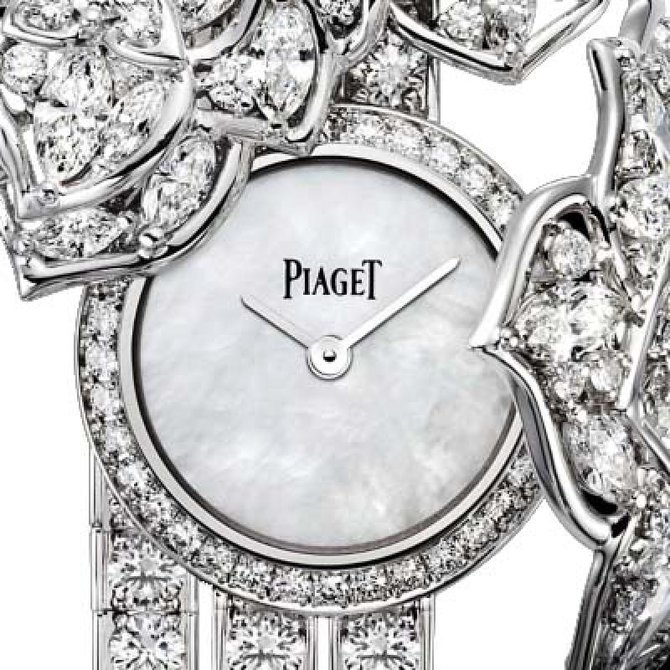 Ставшие эмблематическими изделиями Дома Piaget уже в 1970-х годах, часы с секретом скрывают свое истинное предназначение под виртуозно выполненным ювелирным покровом. В волшебном саду Дома три роскошные розы, выполненные по канонам Высокого ювелирного искусства, придают времени особое очарование. Под одной из них скрыт миниатюрный циферблат. При взгляде на него становится очевидно все мастерство ювелиров Piaget из мастерской Высокого ювелирного искусства: закрепленные крапанами бриллианты круглой огранки и огранки «маркиза» составляют ажурную конструкцию, позволяющую беспрепятственно любоваться блеском камней. Эта необычная техника закрепки дополнена гибким браслетом в технике «парижское плетение», прекрасно приспосабливающимся к форме запястья. Для создания этого исключительного изделия понадобилось более 600 часов работы. Водонепроницаемость данной модели до 3 бар(30 метров). Имеют сапфировое стекло. Браслет выполнен из отделки драгоценными камнями, золота. Корпус из белого золота 18 карат со 177 бриллиантами круглой огранки (около 1.9 карата) и 53 бриллиантами огранки «маркиза» (около 6.5 карата). Циферблат из белого перламутра. Браслет со 153 бриллиантами круглой огранки (около 18.4 карата). Кварцевый механизм Piaget 56P. Застежка интегрированная.