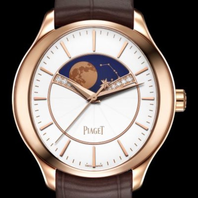 Женственная ювелирная модель Stella в ультратонком корпусе из розового 18-каратного золота вошла в коллекцию "Limelight" швейцарского часового бренда Piaget. Толщина корпуса всего 6 миллиметров, а диаметр - 36 миллиметров. Внутри корпуса установлен швейцарский калибр 584P, отвечающий за индикацию текущего времени в часах, минутах и секундах, а индикатор лунных фаз дает основание называть модель астрономической. 135-зубчатое колесо гарантирует появление разных фаз Луны в окружении звезд. Циферблат наделен золотыми метками и стрелками, а в качестве украшения применялись белые бриллианты. Ремешок коричневого цвета пошит из кожи аллигатора. На циферблате в качестве украшения размещены белые бриллианты.