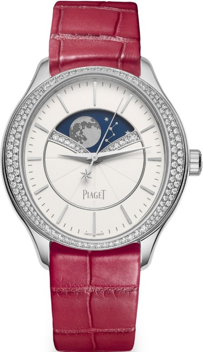 Эффектная линейка Limelight от Piaget стала еще шире - ее пополнила модель женских швейцарских часов Stella G0A40111 Red. Корпус часов, выполненный в диаметре 36 мм из белого золота, хранит внутри себя качественный швейцарский автоматический калибр 584P, обеспечивающий индикацию часов, минут, секунд и фаз Луны. Женские швейцарские астрономические часы укомплектованы ярким красным ремешком из кожи аллигатора и золотой пряжкой. Циферблат украшают белые бриллианты и индикатор лунных фаз. Также бриллиантами украшен и безель. Лаконичная отделка камня позволяет увидеть его уникальную текстуру. Стрелки и часовые метки сделаны из белого золота. Корпус часов с 30-метровой водостойкостью. Толщина корпуса всего 6 мм. Представленная часовая модель удачно сочетает в себе блеск белого золота и драгоценных камней.
