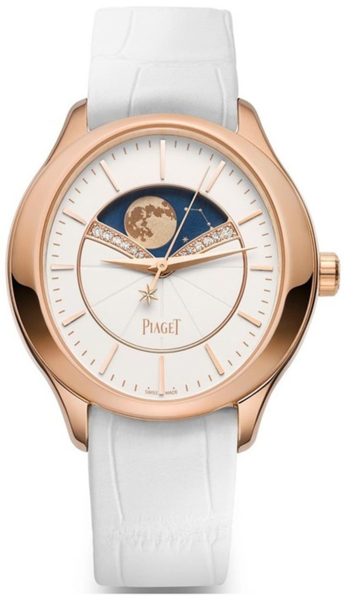 Женственная ювелирная часовая модель Stella в ультратонком корпусе из розового 18-каратного золота вошла в коллекцию "Limelight" швейцарского часового бренда Piaget. Толщина корпуса всего 6 миллиметров, а диаметр - 36 миллиметров. Внутри корпуса установлен швейцарский калибр 584P, отвечающий за индикацию текущего времени в часах, минутах и секундах, а индикатор лунных фаз дает основание называть модель астрономической. 135-зубчатое колесо гарантирует появление разных фаз Луны в окружении звезд. Циферблат наделен золотыми метками и стрелками, а в качестве украшения применялись белые бриллианты. Ремешок белого цвета пошит из кожи аллигатора.