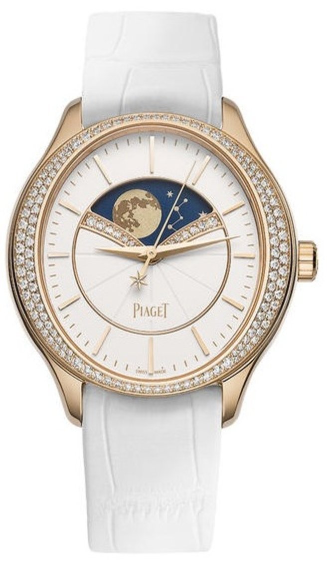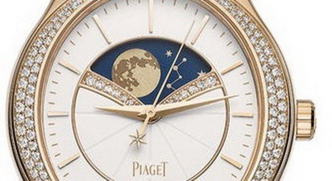 Женственная ювелирная часовая модель Stella в ультратонком корпусе из розового 18-каратного золота вошла в коллекцию "Limelight" швейцарского часового бренда Piaget. Толщина корпуса всего 6 миллиметров, а диаметр - 36 миллиметров. Безель и циферблат инкрустированы белыми бриллиантами. Внутри корпуса установлен швейцарский калибр 584P с автоподзаводом, отвечающий за индикацию текущего времени в часах, минутах и секундах, а индикатор лунных фаз дает основание называть модель астрономической. 135-зубчатое колесо гарантирует появление разных фаз Луны в окружении звезд. Циферблат наделен золотыми метками и стрелками, а в качестве украшения применялись белые бриллианты. Ремешок белого цвета пошит из кожи аллигатора. Доступна модель с ремешком бежевого цвета.