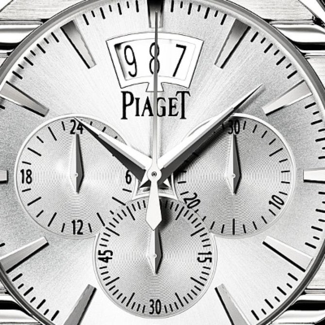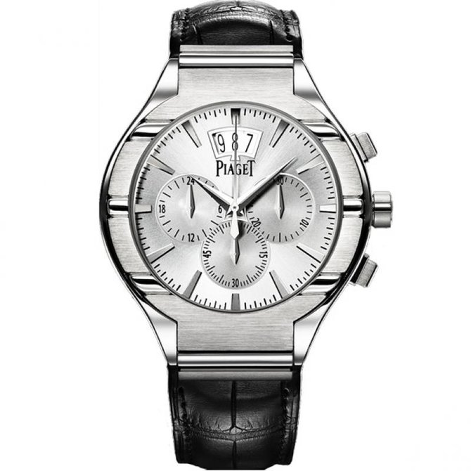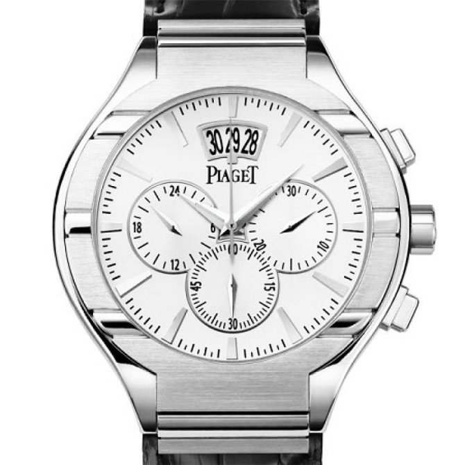 Выполненные из белого золота часы Piaget Polo впервые оснащаются механизмом хронографа. Истинное произведение Высокого часового искусства, эта модель калибра 880Р с колонным колесом и вертикальным сцеплением оснащена центральной секундной стрелкой с функцией flyback, счетчиком минут, малой секундной стрелкой, указателем второго часового пояса и большим указателем даты. Два заводных барабана обеспечивают запас хода 50 часов. Ротор автоматического механизма украшен гербом Piaget. Водонепроницаемость данной модели до 5 бар(50 метров). Имеют сапфировое стекло. Браслет выполнен из кожи аллигатора. Застежка раскладывающаяся. Корпус из белого золота 18 карат. Циферблат с часовыми индексами из белого золота 18 карат. Задняя крышка из сапфирового стекла. Ультратонкий мануфактурный механизм с автоматическим подзаводом Piaget 880Р. Хронограф, малая секундная стрелка, указатель даты, указатель времени второго часового пояса.