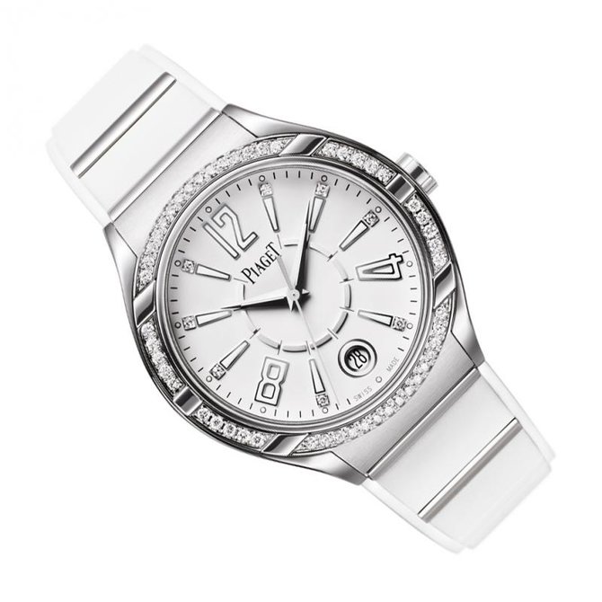 Часы Piaget Polo FortyFive настраиваются на волну чувственности. В основе элегантной женской модели лежит эстетическая концепция спортивной роскоши, дополненная изысканной бриллиантовой отделкой. Эти часы из белого золота призваны стать верным спутником своей обладательницы во всех жизненных ситуациях. Украшенный бриллиантами ободок придает особую выразительность белому циферблату c арабскими цифрами и бриллиантовыми индексами. Поистине беспроигрышное контрастное сочетание драгоценных материалов и каучукового ремешка. Утонченное часовое произведение в непринужденном исполнении. Водонепроницаемость данной модели до 5 бар(50 метров). Имеют сапфировое стекло. Браслет выполнен из каучука. Застежка классическая. Корпус из белого золота 18 карат с 50 бриллиантами круглой огранки (около 0.7 карата) и рельефными полосками из белого золота 18 карат. Циферблат с люминесцентными часовыми индексами из белого золота 18 карат с 8 бриллиантами круглой огранки (около 0.05 карата). Кварцевый механизм Piaget 15P. Секундная стрелка, указатель даты.