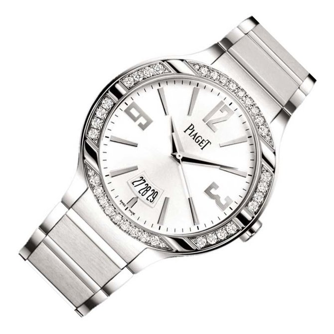 Часы Piaget Polo – эмблема Дома – пользуются неизменной популярностью на протяжении десятилетий благодаря своему исключительному впечатляющему дизайну. Идеально интегрированный в корпус браслет, чередование и контраст полированных и матовых поверхностей, расположенные с регулярными интервалами рельефные полоски: все эти элементы складываются в узнаваемое с первого взгляда гармоничное целое. Часы обретают современный облик, не теряя при этом своего винтажного характера, который очень быстро принес им популярность у знаменитостей. Сегодня модели с золотым браслетом несколько увеличиваются в диаметре, а их тщательно продуманные изгибы обеспечивают повышенный комфорт при ношении. Порыв непринужденности в мире, где царит элегантность. Часы с корпусом диаметром 40 мм оснащены механизмом с автоматическим подзаводом с большим указателем даты. Модель представлена в версии из белого золота с бриллиантами на ободке. Водонепроницаемость данной модели до 3 бар(30 метров). Имеют сапфировое стекло. Браслет выполнен из золота. Застежка раскладывающаяся. Корпус из белого золота 18 карат с 38 бриллиантами круглой огранки (около 1.1 карата). Циферблат и часовые индексы из белого золота 18 карат. Браслет из белого золота 18 карат. Мануфактурный механизм Piaget 504P с автоматическим подзаводом. Секундная стрелка, указатель даты.