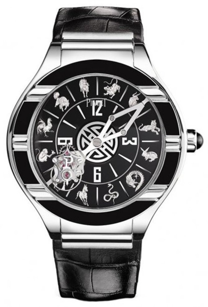 Модель от швейцарской мануфактуры Piaget, посвященная китайским знакам зодиака. Часы посвящены легендарному мануфактурному калибру Piaget - Tourbillon Relatif. На циферблате часов с изображением 12-ти знаков зодиака указываются часы, минуты и секунды. Корпус представлен в белом 18-каратном золоте. Его диаметр - 45 мм. Механизм 608Р отличается наличием функции турбийона. Натуральная кожа атлантического аллигатора послужила материалом для производства ремешка. Классическая застежка выполнена из белого золота. Минимальная герметичность корпуса - 30 метров.