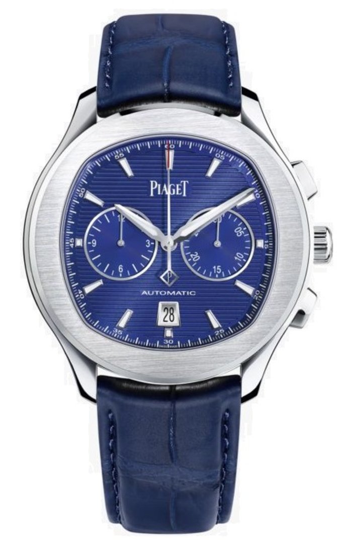 Швейцарские часы от часовой торговой марки Рiaget представлены в корпусе из матовой нержавеющей стали, диаметром 42 миллиметра, который фиксируется на руке ремешком из натуральной кожи аллигатора синего цвета с классической пряжкой. Часовые метки и стрелки на синем циферблате покрыты люминесцентным составом белого цвета для считывания времени и данных в темноте. Индикатор даты расположен в районе 6-часовой отметки. Также на циферблате находятся счетчики хронографа, которой обладает мануфактурный калибр Piaget 1160P. Циферблат защищается устойчивым к царапинам сапфировым стеклом. Водонепроницаемость корпуса - 100 метров.