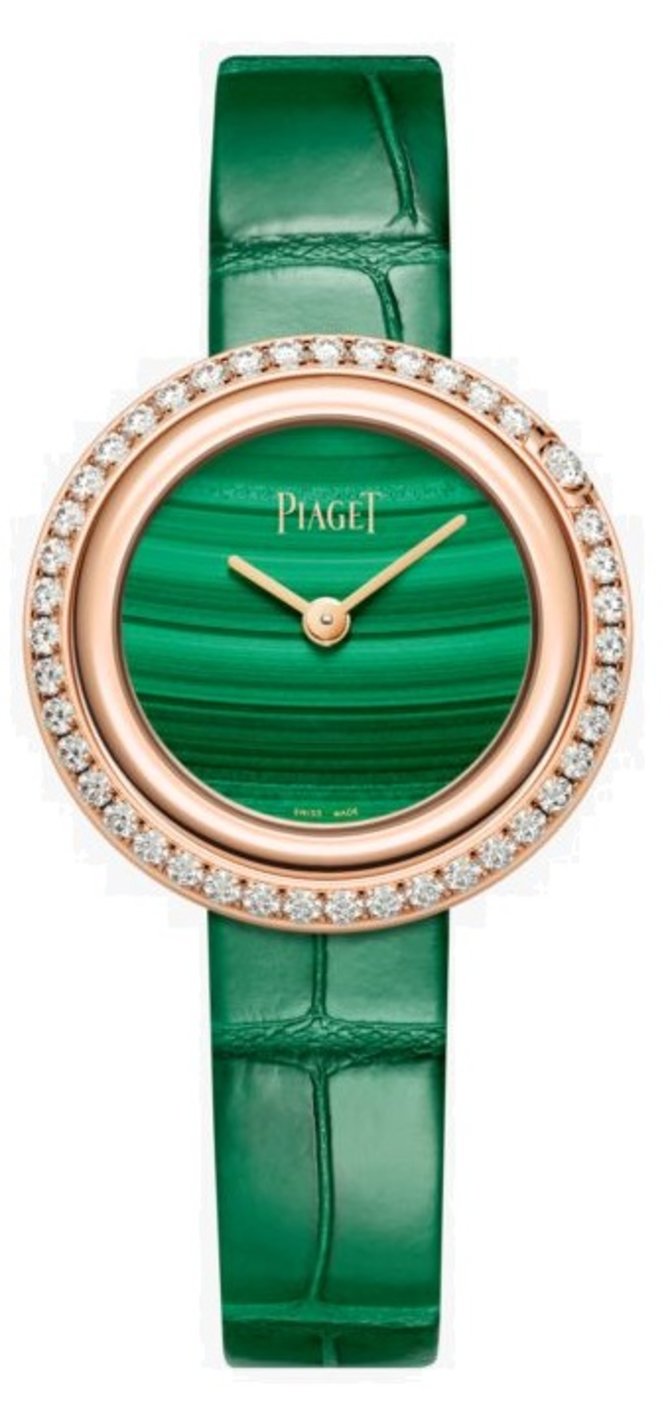 Часы серии Possession имеют зеленый циферблат с золотыми стрелками, показывающими часы и минуты. Корпус из 18-каратного розового золота инкрустирован натуральными бриллиантами классической огранки белого цвета. Часы комплектуются кожаным ремешком ярко-зеленого цвета с застежкой из золота классического типа. Основу этой модели составляет кварцевый часовой механизм, калибр Piaget 56P. Водонепроницаемость - 30 метров. Защищает циферблат стекло из сапфирового кристалла с противобликовым составом. Всего 29-миллиметровый корпус украшают бриллианты, весом более 1 карата.