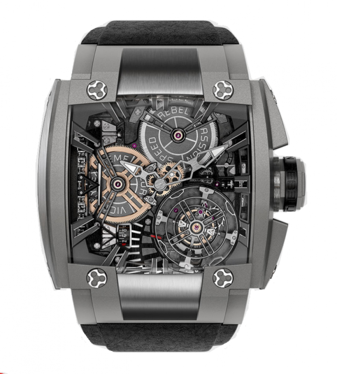 Особенность коллекции Magnum 540 - мануфактурный механизм с малогабаритным парящим турбийоном. Часы обладают настоящим мужским характером. Жесткость, легкость, формальность и выносливость: 540 Magnum был разработан с той же страстью, с которой производятся лучшие выносливые гоночные автомобили. Каждая версия коллекции выпущена ограниченной серией из 10 экземпляров. Мануфактурный механизм REB-T14 выделяется из массы других своим объемом, высокими техническими особенностями и отличной производительностью. Каждая деталь выражает и воплощает страсть к автоспорту. Высокотехнологичные материалы, используемые для производства представленных часов, обладают исключительной легкостью и жесткостью. Rebellion принято считать часами нового поколения. Швейцарская часовая мануфактура Rebellion основалась часовщиком Лореном Бессе, а также дизайнером Эриком Жиро. Эта марка является новой жемчужиной современного мирового рынка. Она достаточно молодая. Официально основана в 2008 году и со дня своего основания зарекомендовала себя как весьма перспективный производитель революционных часовых моделей.