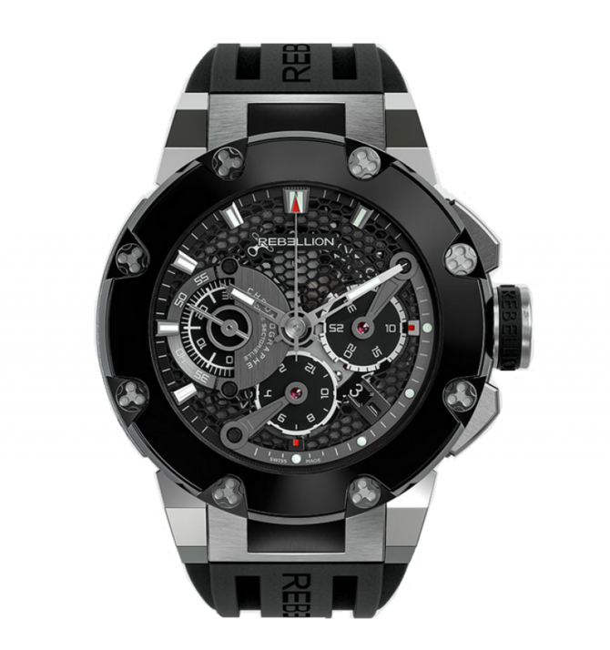 Кроме удачного сочетания углов корпуса, Predator Chrono также предлагает идеальное сочетание часовой и автомобильной эстетики. Каждая деталь дизайна напоминает гоночные механизмы высокой производительности. Часы декорированы брендовыми винтами Rebellion и запатентованной раскладывающейся пряжкой. Имея щедрый 50-часовой запас хода, хронограф и индикатор даты, эта модель способна расположить к себе даже самых прихотливых ценителей часового искусства. Хронограф представлен в нескольких вариантах корпуса. Predator Chrono способны адаптироваться к желаниям того, кто находится в водительском сиденье в пределах своей высокой производительности. Механизм: надежный и точный швейцарский хронограф гарантирует точное измерение времени на гоночном треке. Механизм состоит из керамики, угля и стали; он обладает особым характером и высокой производительностью. Проследить за его работой можно через просвещающуюся заднюю крышку из прочного сапфирового стекла.