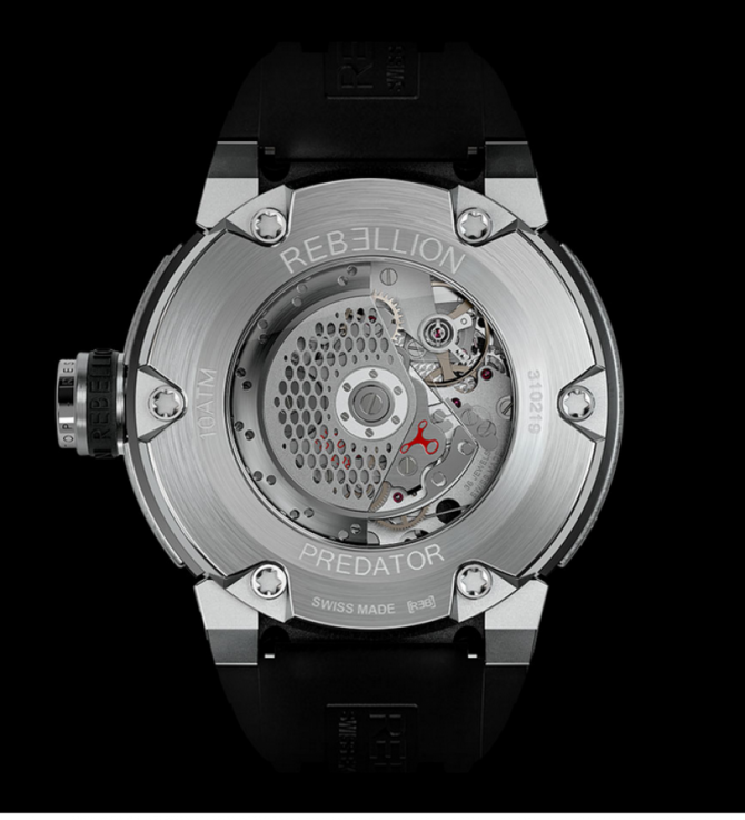 Швейцарских наручные часы Mono-Pusher, коллекции Predator, собраны из многочисленных технических материалов и оснащены механизмом с высокой производительностью. Их круглые и угловые объемы мгновенно узнаваемы. Уникальный и самобытный пушер контролирует работу хронографа, а также установку текущего времени. Модель идеально подходит всем автолюбителям! Хронограф обладает щедрым запасом хода - 50 часов, отображаемым на циферблате часов с помощью специального индикатора. Predator Mono-Pusher функционирует на автоматическом механизме швейцарской сборки. Он состоит из разнообразных технических материалов: керамики, карбона (углерода) и стали. Задняя крышка из сапфирового стекла демонстрирует вид на сердце часов с 50-часовым запасом хода. Как и другие коллекции марки Rebellion, линия Predator выделяется из массы других собственным подходом мастеров фирмы к современному часовому мастерству. Модель доступна в 4 вариантах корпуса - сталь, сталь/керамика, золото, золото/керамика.
