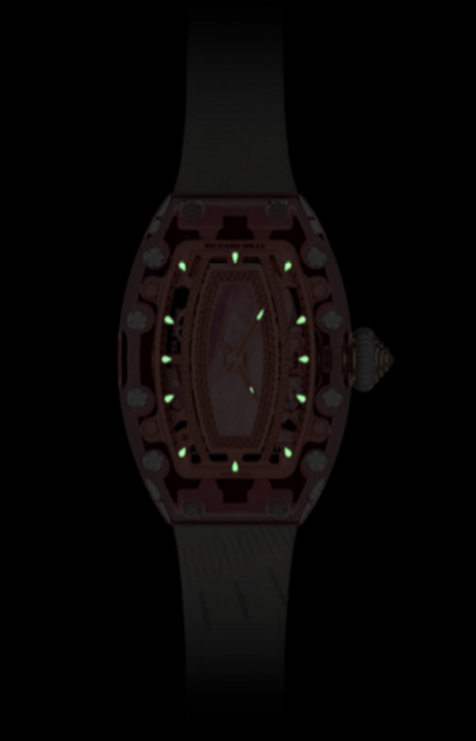 Новая модель от швейцарской мануфактуры RM выпущена в корпусе из просвещающегося розового сапфира. На ювелирном часовом циферблате из розового золота и перламутра в окружении бриллиантов золотыми стрелками указываются часы и минуты. Индикацию обеспечивает мануфактурный швейцарский механизм с ручным подзаводом от RM. Каучуковый ремешок с золотой пряжкой - в комплекте. Механизм с балансовой частотой 28 800 пк/час. Противоударное устройство Incabloc 908/22/211/100.