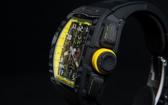 Бренд Richard Mille представляет модель наручных часов в бочкообразном корпусе, диаметром 50 х 40 миллиметров и толщиной 16.15 миллиметров, изготовленном из карбона (углеродное волокно). Заводная головка с каучуковой вставкой (для избежания скольжения пальцев). Часы функционируют на механическом швейцарском механизме с автоматическим подзаводом. Механизм наделен хронографом с функцией Flyback. Задняя крышка корпуса выполнена из сапфирового стекла, сквозь которое видна механика часов. Защитное лицевое стекло также сапфировое. Модель укомплектована каучуковым ремешком. Часовые метки и наконечники стрелок покрыты специальным фотолюминесцентным покрытием, светящимся в темноте. Лимитированный тираж - 50 экземпляров.