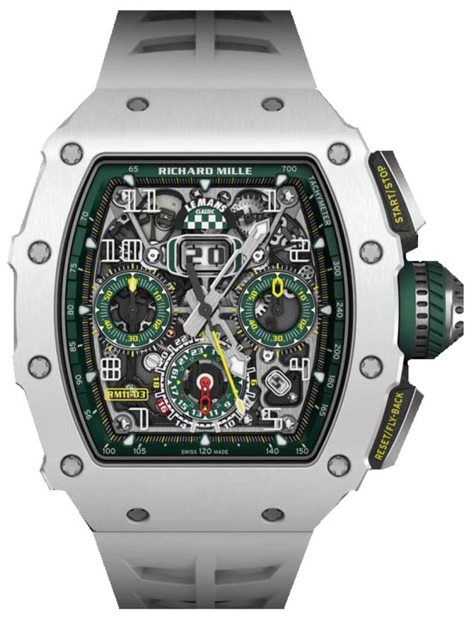 Корпус швейцарских часов Watches RM 11-03 Le Mans Classic RM 11-03 Le Mans Classic от мануфактуры Richard Mille выполнен в форме бочки из керамики в размере 49.94 x 44.5 x 16.15 мм. Корпус отличается водонепроницаемостью до 50 метров. Стекло для защиты скелетонированного циферблата выполнено из сапфирового кристалла и покрыто специальным противобликовым составом. Для фиксации часов на руке предусмотрен ремешок белого цвета из каучука и классическая застежка из титана. Внутри часов находится надежный автоматический механизм RMAC3 мануфактурного производства Richard Mille с хронографом.