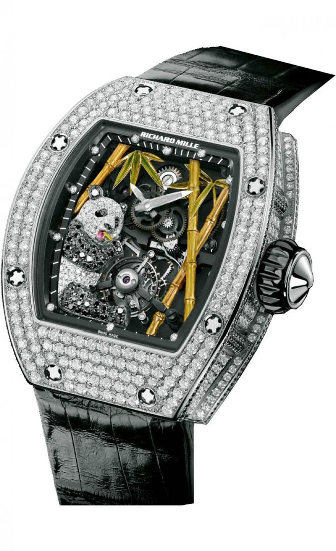 Панду любят во всём мире, благодаря его облику большой мягкой игрушки и вегетарианскому образу жизни. Она стала синонимом дружелюбности и невинности. Панда изображена на эмблеме Всемирного фонда дикой природы (WWF). Большая панда, фактически является символом Китая. Все смотрели «Кунг-фу-панда», искренне сопереживая пятнистому фанату кун-фу. И Ришар Милль, не чуждый китайской культуре, не мог пройти мимо этого симпатичного зверя. Выпущенная в этом году модель Tourbillon RM 26-01 — удачный союз часового мастерства и ювелирного искусства. Изготовленная из 18-каратного белого золота и встроенная в турбийон, панда полностью усыпана бриллиантами и черными сапфирами. Подобно тому, как панда живет в бамбуковой роще, естественной среде своего обитания, панда в часах тоже сидит среди бамбуковых стеблей и листьев из желтого золота, которые выложены и окрашены вручную.