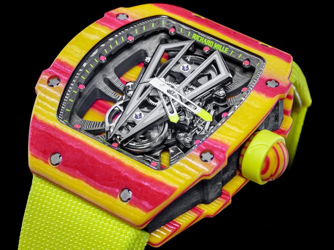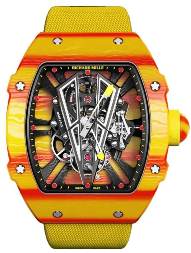 Представляем новые швейцарские часы от Richard Mille - RM 27-03, выпущенные для теннисиста Рафаэля Надаля. Можно смело заявить, что это самые яркие часы Надаля, да еще и с совершенно новым механизмом мануфактурной разработки Richard Mille внутри. Механизм оснащен турбийоном. Бренд выпустил часы RM 27-03 ограниченным тиражом в 50 экземпляров. Известно, что знаменитый теннисист и часовой производитель Richard Mille стали партнерами еще в 2010 году. Также отметим, что Надаль на самом деле носит во время игры аксессуары от компании Richard Mille. Корпус данной модели выполнен из ультралегкого карбонового сплава (сочетание смолы и диоксида кремния). Размеры: 47,77 мм х 40,3 мм х 12,75 мм. Цветовая гамма, в которой выполнены часы, напоминает испанский флаг - флаг родины Надаля. Противоударный механизм может противостоять ударам до 10 000 Gs. Мосты изготовлены из титана, а опора представляет собой скелетонированную несущую плиту из карбона. Запас хода установленного механизма с турбийоном - 70 часов.