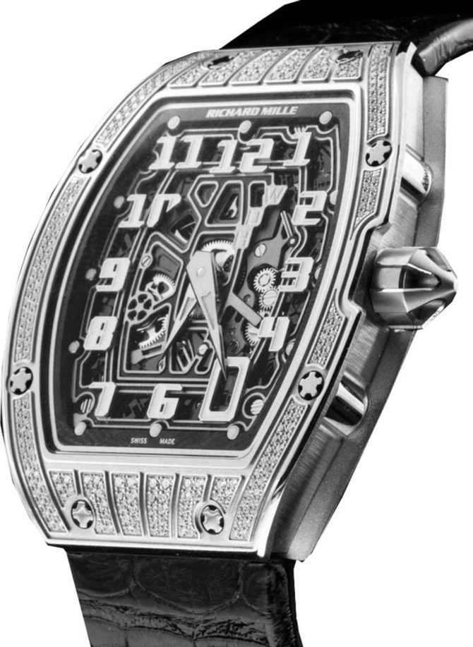 Титановый корпус наручных часов от швейцарской мануфактуры Richard Mille инкрустирован драгоценными камнями - белыми бриллиантами огранки "классик". Внутри ювелирного корпуса инженерами марки Richard Mille установлен механический калибр CRMA6 с запасом хода на 50 часов, а также автоматическим подзаводом. Стеклом из сапфирового кристалла закрыт циферблат-скелетон, где указываются часы, минуты, дата, а также из сапфирового стекла выполнена задняя крышка, прозрачность которой позволяет следить за работой механизма, в частности ротора из титана. ремешок пошит из чистой кожи аллигатора черного цвета. Классическая пряжка из титана украшена бриллиантами. Водонепроницаемость титанового корпуса с бриллиантами составляет 50 метров.