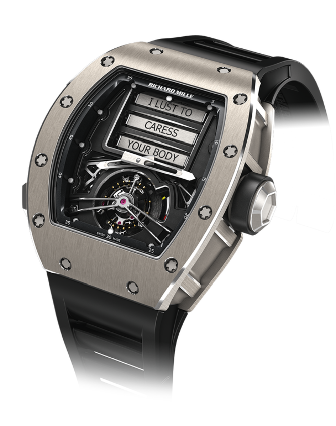 Новинка, выпущенная ограниченной серией компанией Richard Mille и разработанная вместе с Audemars Piguet Renaud & Papi (APRP), носит имя Erotic Tourbillon не в связи с какими-то эротическими иллюстрациями на часах, а в связи с появляющимися надписями на циферблате эротического содержания, например, "I need to explore your lips" (я хочу изучать твои губы) и "I want to caress you madly" (я безумно хочу тебя ласкать). Корпус часов выполнен из титана. Он состоит из трех частей, скрепленными между собой 20 винтами из титана. Диаметр корпуса - 50 миллиметров; толщина - 16.15 миллиметров. Корпус имеет полированные и сатинированные поверхности. С двух сторон, лицевой и задней, корпус закрыт просвещающимся сапфировым стеклом. Часовые индексы и стрелки покрыты люминесцентным покрытием. Часы приводит в действие механизм с ручным заводом производства мануфактуры Renaud & Papi. Он состоит из 505 элементов. Запас хода - 69 часов. На циферблате отображаются часы, минуты, уровень запаса хода, а также расположена каретка турбийона. Выпуск ограничен 30 экземплярами!