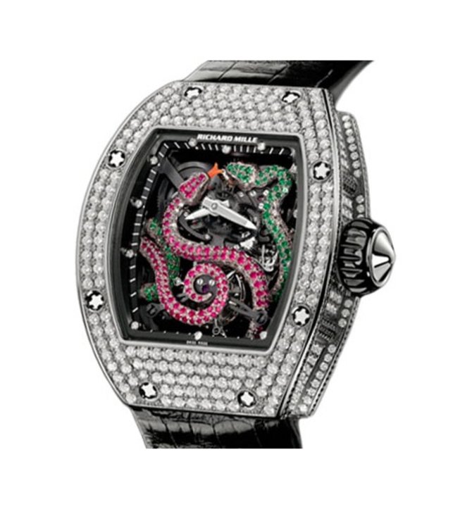 Шикарная модель дамских наручных часов со швейцарским мануфактурным механизмом с турбийоном, работающим от ручного подзавода, представлена в корпусе из белого золота, полностью инкрустированном белыми бриллиантами. На циферблате с кареткой турбийона, индицирующем часы и минуты, размещены фигуры из драгоценных камней в виде змей. Ремешок, которым укомплектована данная модель, пошит из крокодильей кожи. Герметичность корпуса составляет 50 метров. Год выпуска часов - 2013. Циферблат под защитой сапфирового стекла. Классическая застежка, с помощью которой часы крепятся к запястью, выполнена из белого золота. Сам Милль, создающий свои концепты, запершись в собственном замке в Бретани, словно тайный дирижер руководит оркестром из самых различных фабрик, на каждой из которых он имеет свой эксклюзивный отдел производства.